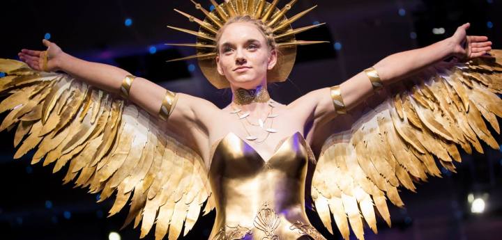 The first look, titled “The Guardian,” was my vision of a guardian angel. I wanted to create something that combined grace and beauty with fierceness and strength. Inspiration for this look began with my memory of seeing the Winged Victory of Samothrace at the Louvre ten years ago. I remember coming up a staircase, turning, being completely taken aback by the sight of this sculpture. Of all of the art that I saw that day, she was the one that has stayed with me all these years. Because of this, I began with research on the goddess of Victoria, which revealed that she was the symbol of victory over death in all endeavors. Images of winged women were seen all over the Roman Empire, and after the Christianization, those figures evolved into Christian angels. This discovery lead to further research on depictions of angels throughout art history. I pulled inspiration from Byzantine mosaics showing large gold circles representing halos, Italian Renaissance paintings which had softer more ethereal portrayals of angels, as well as other images of angels, goddesses, and warriors. This all came together to form my vision of “The Guardian.”
